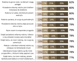 • 84% ankietowanych widzi w rodzinie źródło psychicznego i moralnego wsparcia i pomocy. Dla 80% niezależnie od okoliczności społecznych i ekonomicznych, budowanie własnej rodziny ma sens.